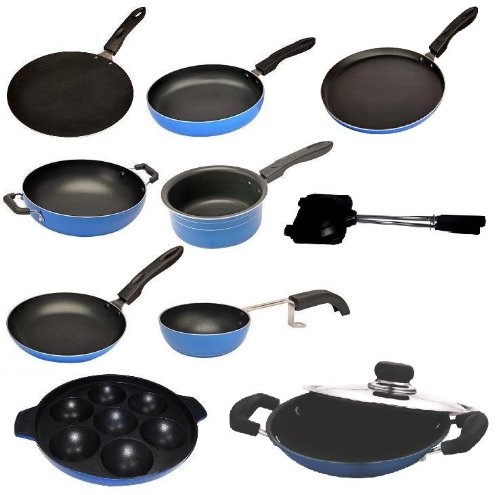 - Package Contents: 1-Piece Dosa Tawa (25cm), 1-Piece Fry Pan (22cm),1-Piece Chappati Tawa (25cm), 1-Piece Deep Kadhai with SS Lid (2.5 Litres), 1-Piece Saucepan (1.5 Litres), 1-Piece Taper Pan (25cm), 1-Piece Tadka Pan, 1-Piece Sandwhich Toaster, 1-Piece Appam Patra 7-Cavity and 1-Piece Appa Chatti (22cm)