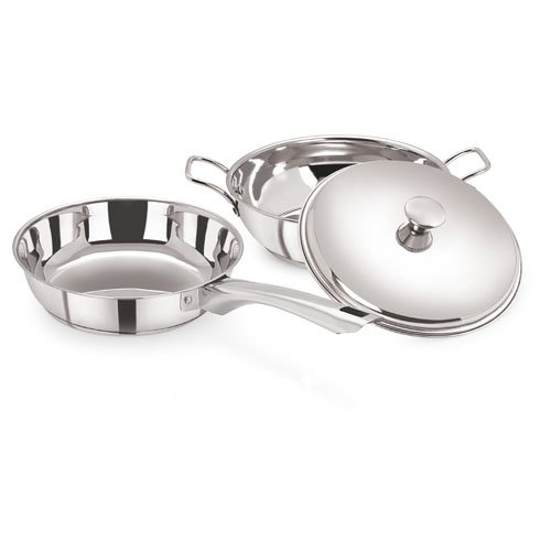 Pristine Eco Induction Compatible Stainless Steel Sandwich Base Cookware Set, (Fry Pan with SS Lid 22 cm, Kadai 22 cm), 2PC, Silver